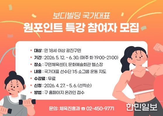 한민일보 서울포커스 최성훈 기자 | 광진구가 구민의 건강한 여가생활과 생활체육 활성화를 위해 ‘국가대표와 함께하는 원포인트 특강’을 운영한다.