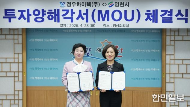한민일보 서울포커스 김봉순 기자 | 영천시는 28일 시청 영상회의실에서 자동차 부품 전문기업인 정우하이텍㈜과 150억원 규모의 투자협약(MOU)을 체결했다.