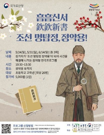 한민일보 서울포커스 김성윤 기자 | 남양주시는 오는 5월 24일과 31일, 6월 14일 정약용 유적지에서 초등학교 고학년을 대상으로 참여형 연극 프로그램 ‘흠흠신서: 조선 명탐정, 정약용!’ 참가자를 모집한다고 밝혔다.