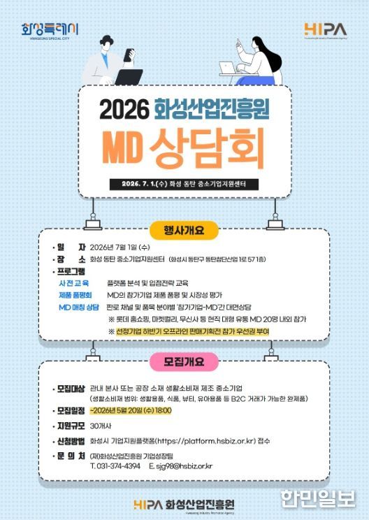 한민일보 서울포커스 진광성 기자 | 화성산업진흥원(원장 전병선)은 화성시 생활소비재 기업의 대형 유통망 진입과 신규 판매채널 확보를 지원하기 위해 ‘2026년 화성산업진흥원 MD 상담회’를 개최하고, 오는 5월 20일까지 참여기업을 모집한다.