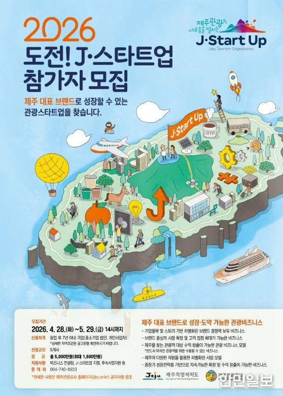 한민일보 서울포커스 임철현 기자 | 제주특별자치도와 제주관광공사(사장 고승철)는 오는 5월 29일까지 온라인 채널을 통해 제주 관광산업 혁신을 선도할 유망 기업을 발굴하고 육성하기 위해 ‘2026 도전! J-스타트업’ 참가기업을 모집하고 있다고 28일 밝혔다.