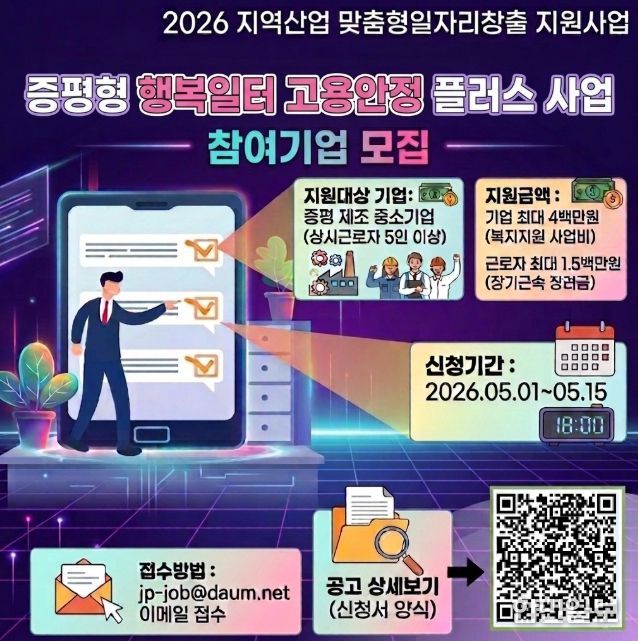 한민일보 서울포커스 김다남 기자 | 충북 증평군이 지역 제조 중소기업의 고용안정과 장기근속 문화 확산을 위해 ‘2026 증평형 행복일터 고용안정 플러스 사업’ 참여기업을 모집한다.