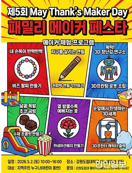 한민일보 서울포커스 곽중희 기자 | 강원도립대학교는 5월 가정의 달을 맞아 가족 참여형 체험 행사인 ‘패밀리 메이커 페스타’를 오는 5월 2일 교내 이노베이션센터에서 개최한다.
