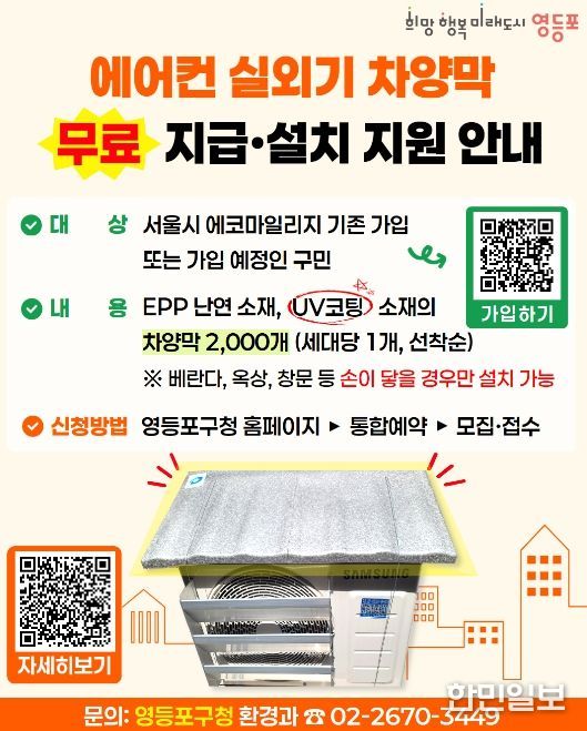 한민일보 서울포커스 임경복 기자 | 영등포구가 다가오는 여름철 무더위에 대비해 구민들의 냉방비 부담을 줄이고 에너지 효율을 높이기 위한 ‘에어컨 실외기 차양막 설치 지원사업’을 추진한다고 밝혔다.