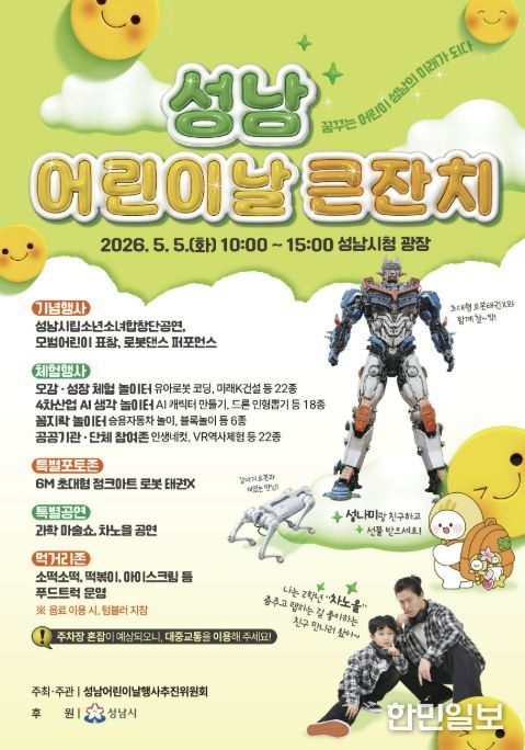 한민일보 서울포커스 김성혜 기자 | 성남시는 오는 5월 5일 시청 광장과 1층 온누리에서 ‘어린이날 큰잔치’를 개최한다.