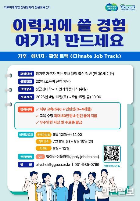 모집 대상은 경기도에 거주하거나 도내 대학교 출신인 만 39세 이하 청년이다. 신청 방법과 교육 과정에 대한 자세한 내용은 경기도일자리포털 ‘잡아바 어플라이’에서 확인할 수 있으며, 기타 문의 사항은 경기환경에너지진흥원을 통해 안내받을 수 있다.