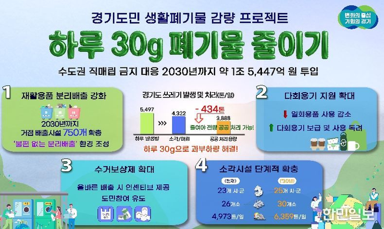 한민일보 서울포커스 김윤이 기자 | 수도권 직매립 금지에 따른 생활쓰레기 감량을 위해 경기도가 2030년까지 5년간 약 1조 5,447억 원을 투입하는 ‘하루 30g, 도민실천형 생활폐기물 감량 프로젝트’를 추진한다.