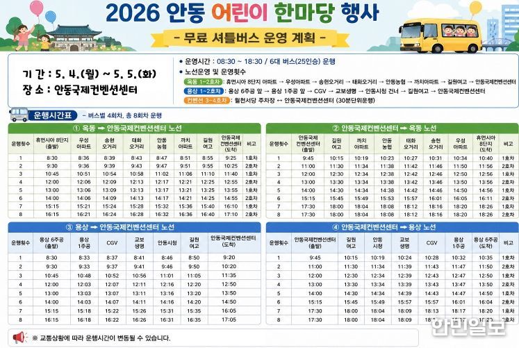 한민일보 서울포커스 김봉순 기자 | 안동시와 안동청년회의소는 제104회 어린이날을 맞아 오는 5월 4일부터 5일까지 안동국제컨벤션센터(ADIC)에서 펼쳐지는 ‘2026 안동 어린이 한마당’ 행사에서, 방문객 편의를 위한 무료 셔틀버스를 운영한다고 밝혔다.
