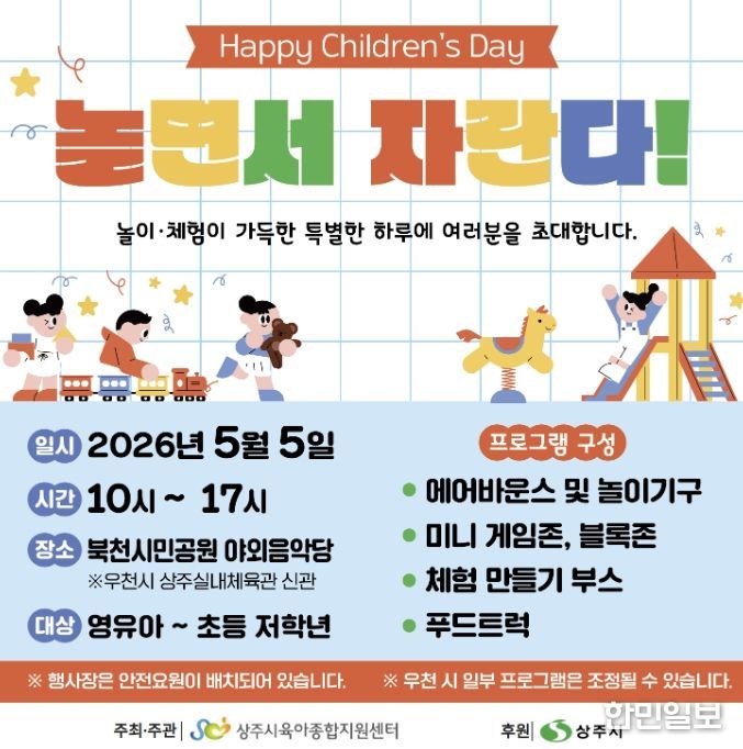 한민일보 서울포커스 김봉순 기자 | 상주시는 제104회 어린이날을 맞아 오는 5월 5일 북천시민공원 야외음악당에서 ‘Happy Children`s Day – 놀면서 자란다!’를 주제로 어린이날 기념행사를 개최한다.