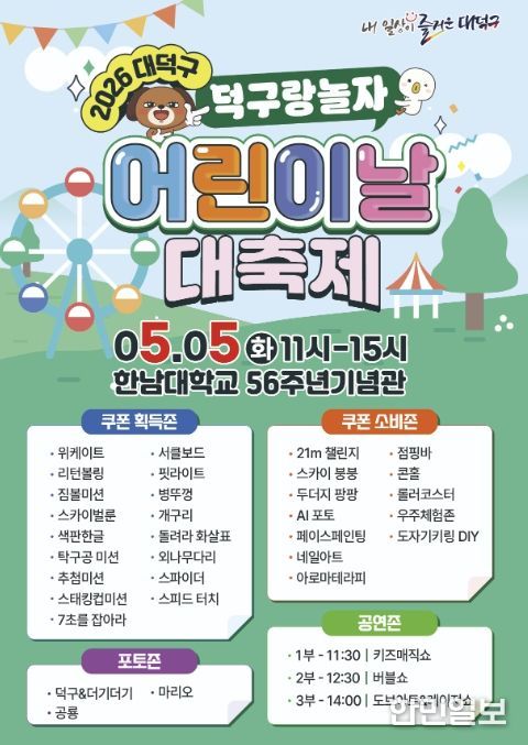 대덕구 관계자는 “아이들이 자유롭게 뛰어놀 수 있는 축제의 장을 마련했다”며 “가족과 함께 소중한 추억을 만드는 시간이 되길 바란다”고 말했다.