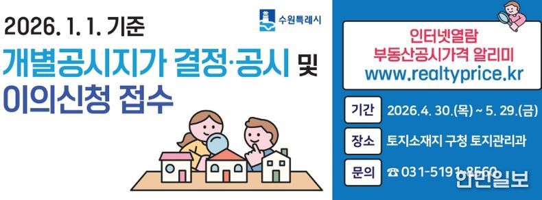 한민일보 서울포커스 진광성 기자 | 수원시 영통구는 2026년 1월 1일 기준 개별공시지가를 4월 30일 결정·공시하고, 5월 29일까지 이의신청 기간을 운영한다.