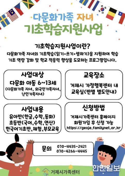 한민일보 서울포커스 김은금 기자 | 거제시가족센터는 다문화가족 자녀의 학교생활 적응과 기초학습 능력 향상을 위해 ‘다문화가족 자녀 기초학습지원 사업’을 운영하고 있다.