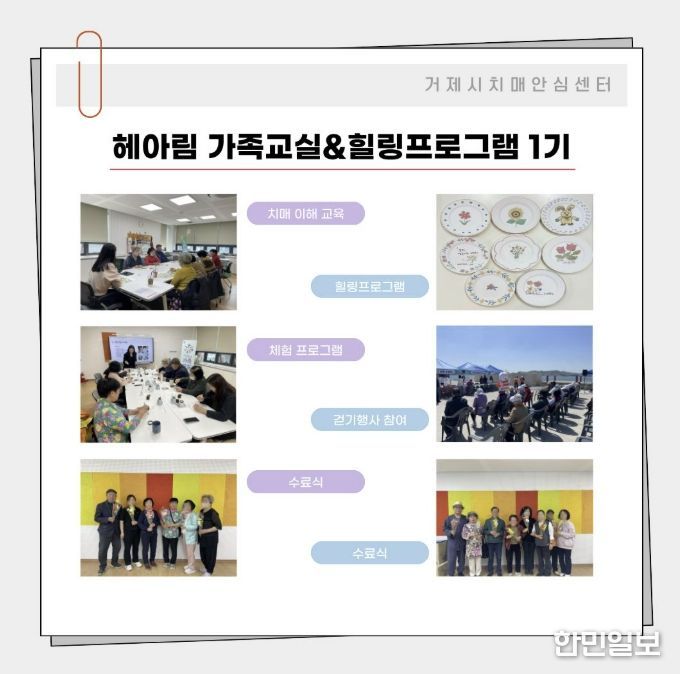 한민일보 서울포커스 김은금 기자 | 거제시치매안심센터는 치매 대상자 가족 지원을 위해 3월부터 4월까지 8주간 ‘헤아림 가족교실’과 ‘힐링프로그램’ 1기를 성공적으로 운영하고 지난주 수료식을 개최했다.
