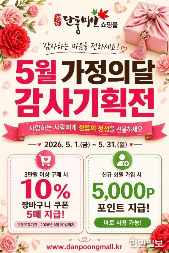 한민일보 서울포커스 김용택 기자 | 정읍시가 다가오는 5월 가정의 달을 맞아 시민과 전국 소비자에게 감사의 마음을 전하고 지역 우수 농특산물 소비를 활성화하기 위해 ‘단풍미인쇼핑몰 5월 가정의 달 기획전’을 운영한다.