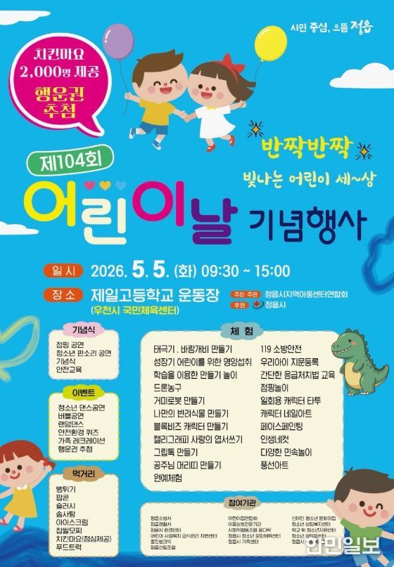 한민일보 서울포커스 김용택 기자 | 정읍시는 다가오는 제104회 어린이날을 맞아 오는 5월 5일 정읍제일고등학교 운동장(우천 시 국민체육센터)에서 어린이날 기념행사를 개최한다.