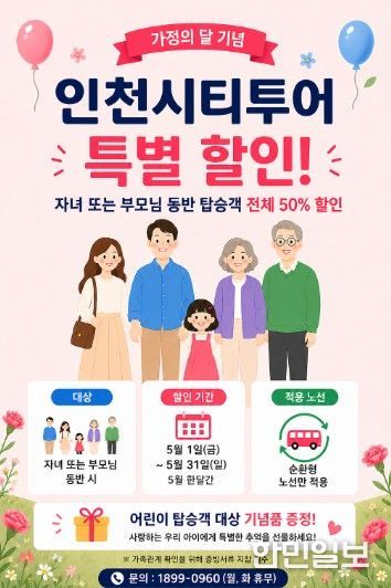 한민일보 서울포커스 유창렬 기자 | 인천관광공사는 5월 가정의 달을 맞아 가족 단위 관광객 유입을 확대하고 이용객의 재방문 활성화를 위한‘인천시티투어 특별 프로모션’을 실시한다고 밝혔다