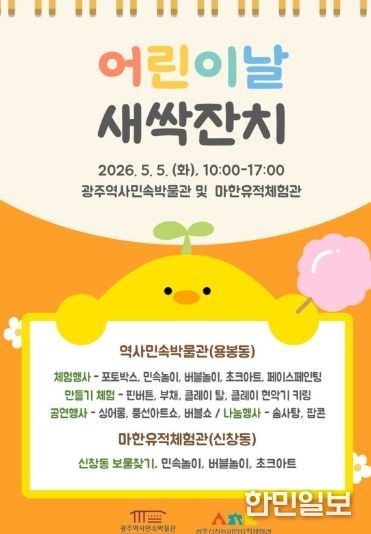한민일보 서울포커스 임경복 기자 | 광주광역시역사민속박물관은 어린이날을 맞아 5일 오전 10시부터 오후 5시까지 북구 용봉동 역사민속박물관 본관과 광산구 신창동 마한유적체험관에서 ‘어린이날 새싹잔치’를 연다.