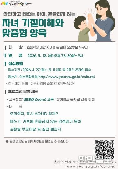 한민일보 서울포커스 백진욱 기자 | 연수구 송도건강생활지원센터는 5월 가정의 달을 맞아 5월 12일, 관내 초등학생 이하 자녀를 둔 부모를 대상으로 ‘자녀 기질의 이해와 맞춤형 양육’ 비대면 교육을 운영한다.