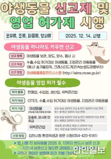 한민일보 서울포커스 임경복 기자 | 김천시는 야생동물의 무분별한 포획·거래를 방지하고 건전한 사육 문화를 정착시키기 위해 야생동물 영업 허가제와 보관·거래 신고제를 시행하고 있다고 밝혔다.