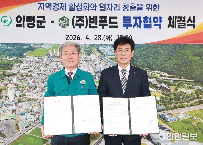 한민일보 서울포커스 김은금 기자 | 의령군은 지난 28일 군수실에서 ㈜빈푸드(대표 홍효선)와 투자협약(MOU)을 체결했다고 밝혔다.
