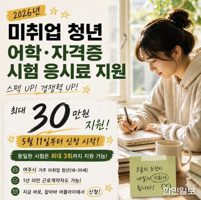 한민일보 서울포커스 전희주 기자 | 여주시는 오는 5월 11일부터 미취업 청년에 어학·자격시험 응시료를 지원하는 ‘경기청년 역량강화 기회지원’ 사업 접수를 시작한다.