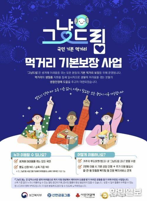 ‘그냥드림(먹거리 기본보장)’은 올해 12월까지 월요일부터 금요일까지 오후 2시부터 5시까지 운영하며, 쌀과 면·빵류, 김, 통조림, 라면 등 식료품과 생활필수품을 1인당 3~5개 품목으로 구성해 제공한다.