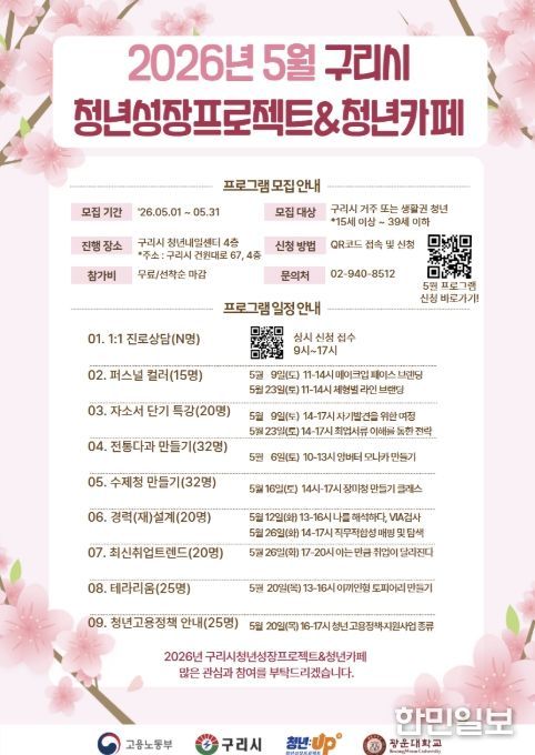 구리시 관계자는 “이번 5월 프로그램은 청년들이 자신을 발견하고, 내일을 설계하며, 지역 안에서 함께 성장할 수 있도록 준비한 자리”라며 “진로와 취업을 고민하는 청년은 물론, 새로운 경험과 교류를 원하는 청년들의 많은 관심과 참여를 바란다.”라고 말했다.