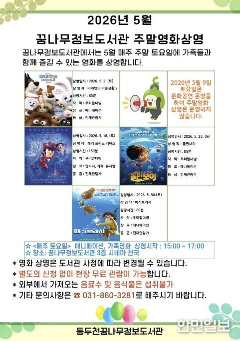 한민일보 서울포커스 임경복 기자 | 동두천시 도서문화사업소 정보도서관에서는 오는 5월 매주 토요일 어린이와 가족을 위한 애니매이션 및 가족영화 4편을 상영한다고 밝혔다.