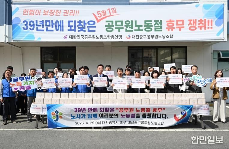 한민일보 서울포커스 임경복 기자 | 대전중구공무원노동조합은 29일 오전 10시 조합 사무실 앞에서 중구청장 및 노동조합 관계자가 함께 ‘39년 만에 되찾은 공무원 노동절 휴무 기념행사’를 개최하고, 63년 만에 노동절 명칭 복원과 120만 공무원, 교사 차별 해소를 경축하는 자리를 가졌다고 밝혔다.