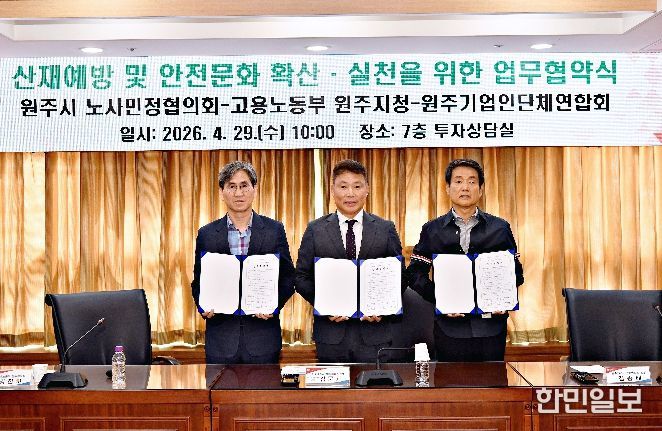 이번 협약은 지역 노사민정 상생협력 사업의 일환인 ‘2026년 찾아가는 小사업장 산재예방 교육’ 추진을 위한 기관 간 업무협약이다. 협약에는 원주시 노사민정협의회와 고용노동부 원주지청, 원주기업인단체연합회가 참여해 안전 문화 확산을 위한 적극적인 지원과 협조를 약속했다.