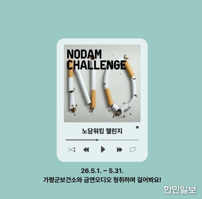 한민일보 서울포커스 최성훈 기자 | 가평군보건소가 ‘세계 금연의 날’을 앞두고 5월 1일부터 한 달간 금연 인식 확산을 위한 ‘노담워킹 챌린지’를 진행한다. 이번 행사는 일상 속 걷기 실천과 금연 홍보를 병행해 군민들의 건강한 생활 습관 형성을 돕고자 마련됐다.