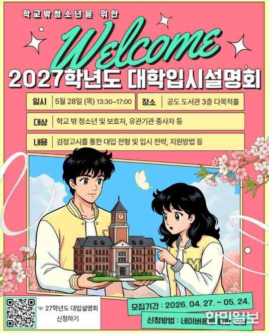 한민일보 서울포커스 임경복 기자 | 안성시학교밖청소년지원센터는 학교 밖 청소년의 성공적인 진학을 돕기 위해 오는 5월 28일 오후 1시 30분부터 공도 도서관 다목적홀에서 ‘2027학년도 대학 입시 설명회’를 개최한다고 밝혔다.