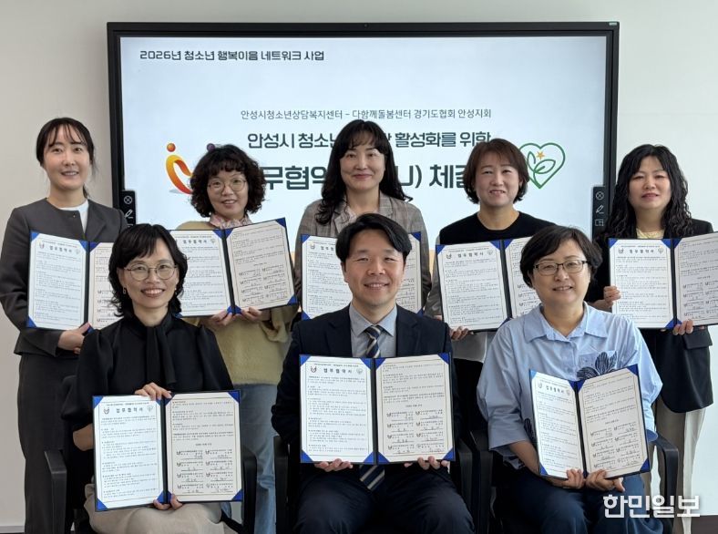 한민일보 서울포커스 임경복 기자 | 안성시청소년상담복지센터는 지난 27일 안성맞춤공감센터에서 다함께돌봄센터 경기도협의회 안성지회와 청소년의 건강한 성장과 복지 증진을 위한 업무협약(MOU)을 체결했다.