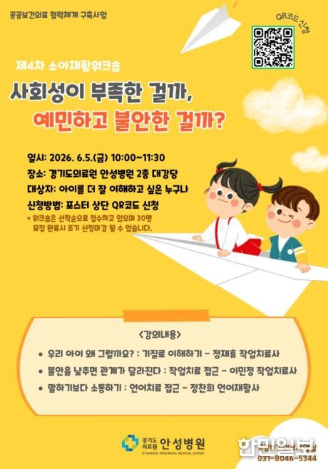 행사는 2026년 6월 5일 오전 10시부터 11시 30분까지 경기도의료원 안성병원 2층 대강당에서 진행되며, 주요 내용은 아동 기질 이해(작업치료 접근), 불안 감소를 통한 관계 개선, 언어 및 의사소통 중심 상호작용 방법 등으로 구성된다. 참가 대상은 “아이를 더 잘 이해하고 싶은 누구나”이며, 선착순 30명으로 모집한다. 신청은 포스터 내 QR코드 및 유선 접수를 통해 가능하며 조기 마감될 수 있다.