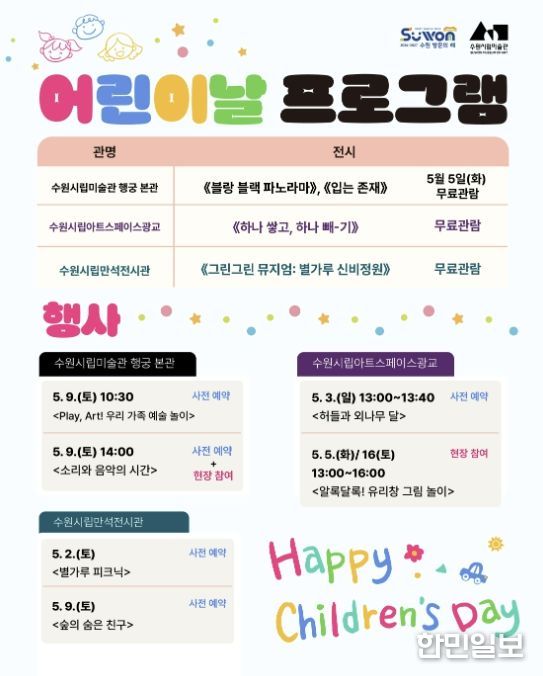 수원시립미술관 남기민 관장은 “어린이날을 맞아 다양한 전시와 프로그램을 통해 미술관의 문턱을 낮추고 다채로운 체험과 추억을 만드는 시간이 되길 바란다”라고 밝혔다.