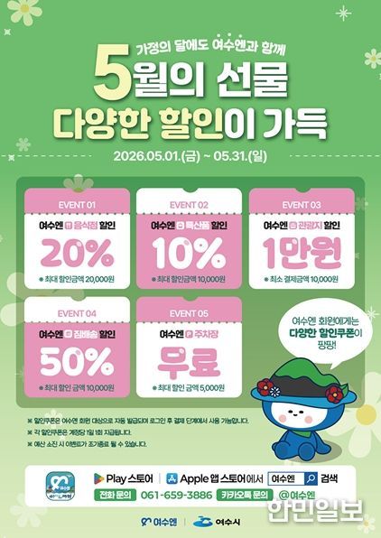 시 관계자는 “가정의 달을 맞아 관광객들이 ‘여수엔’을 통해 다양한 할인 혜택과 축제 연계 프로그램을 함께 즐기며 더욱 풍성한 여행이 되길 바란다”며 “앞으로도 체감도 높은 혜택과 즐길 거리를 지속 확대해 나가겠다”고 말했다.