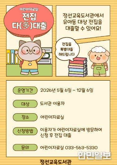 한민일보 서울포커스 진광성 기자 | 정선교육도서관은 5월 6일부터 12월 6일까지 어린이자료실에서 어린이자료실 이용 활성화와 지역 내 독서 문화 확산을 위해 ‘전집다(多)대출’을 운영한다.
