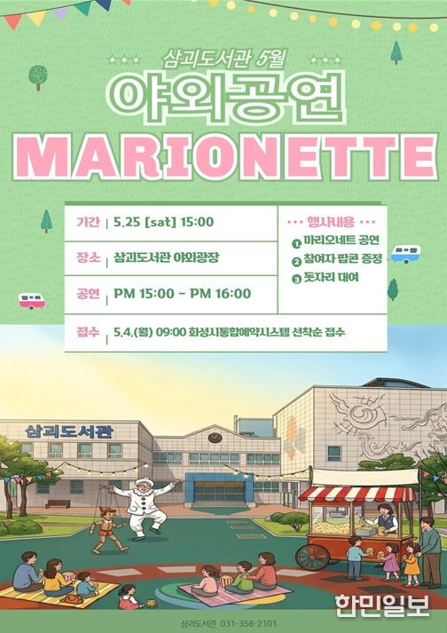 한민일보 서울포커스 진광성 기자 | 화성시립 삼괴도서관은 5월 가정의 달을 맞아 오는 5월 23일, 도서관 야외광장에서 가족 단위 이용자를 위한 특별한 문화행사를 운영한다. 따뜻한 봄날의 야외 공간에서 누구나 편안하게 즐길 수 있도록 마련된 이번 행사는 도서관을 찾는 시민들에게 색다른 문화 경험과 여유로운 시간을 제공할 예정이다.