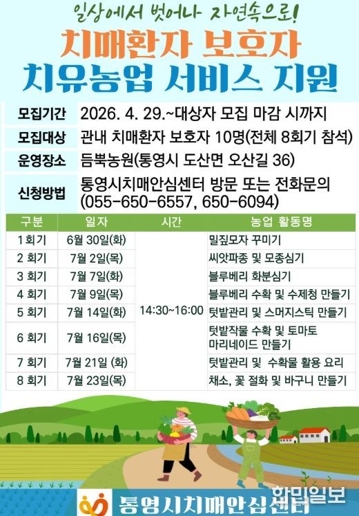 한민일보 서울포커스 김서윤 기자 | 통영시 치매안심센터는 치매환자를 돌보는 보호자의 정서적 안정과 돌봄 부담경감을 위해 치매환자 보호자 치유농업서비스를 오는 6월 30일부터 7월 23일까지 주 2회, 총 8회기에 걸쳐 운영한다.