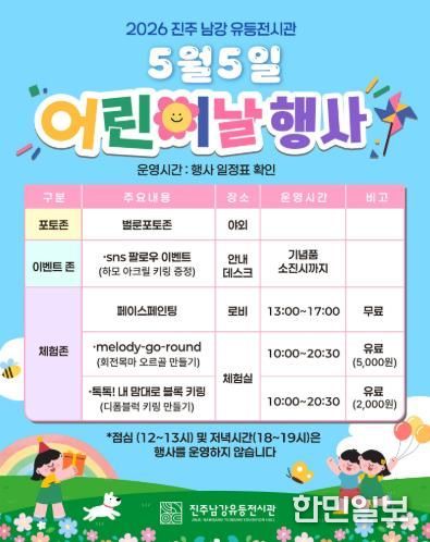 한민일보 서울포커스 김은금 기자 | 진주시는 다가오는 5월 가정의 달과 어린이날을 맞아 박물관·미술관 등의 문화시설에서 다채로운 문화 체험 행사를 개최한다고 밝혔다.