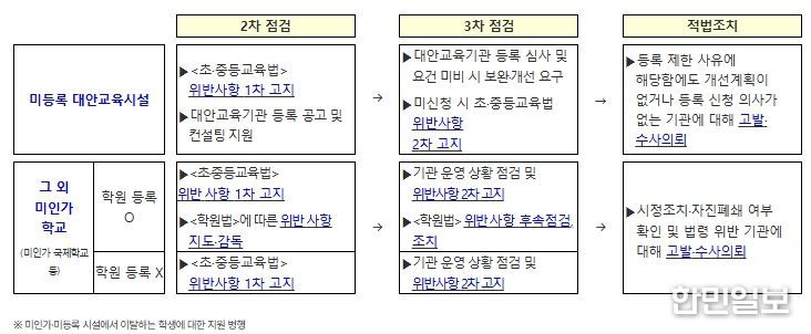 아울러, 교육부와 시도교육청은 이번 조치로 기관이 폐쇄되거나, 미인가·미등록 시설임을 인지하여 시설에서 이탈하는 학생·학부모에 대한 지원도 한층 더 강화한다.