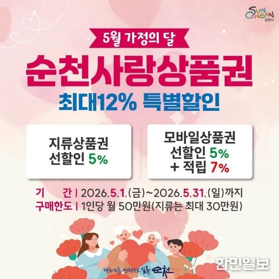 한민일보 서울포커스 임광현 기자 | 순천시가 5월 한 달간 순천사랑상품권 특별 할인행사를 추진해 시민들의 가계 부담을 덜고 지역 소상공인에게 활력을 불어넣는 소비 촉진에 나선다.