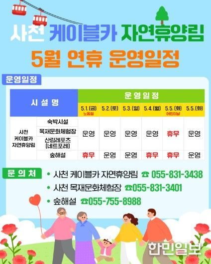 한민일보 서울포커스 김은금 기자 | 사천시는 5월 가정의 달과 어린이날을 포함한 연휴 기간을 맞아 사천케이블카 자연휴양림의 이용객 편의를 위한 시설별 5월 연휴 운영 계획을 안내했다.