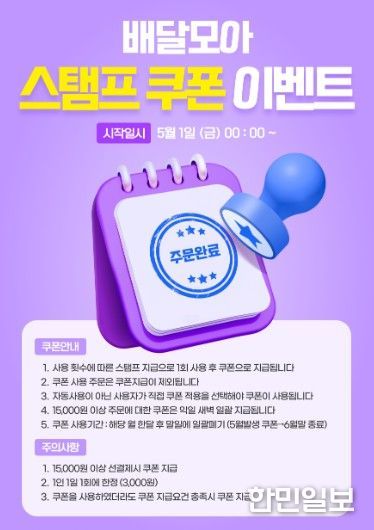 이번 이벤트는 5월 1일부터 배달모아 이용자 선착순 5,000명을 대상으로, 다음 주문 시 사용할 수 있는 3,000원 할인 쿠폰을 지급하는 방식으로 운영된다.
