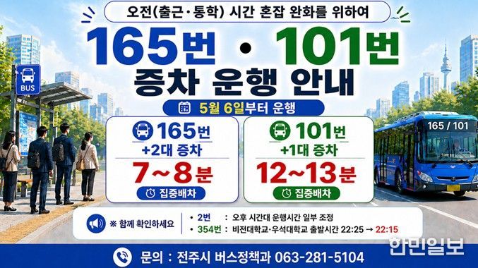 이에 시는 활용 가능한 예비 차량을 혼잡 시간대에 투입해 배차간격을 단축하고, 승객을 분산시켜 차내 혼잡도를 완화하기로 했다. 증차 대상 노선은 165번 노선과 101번 노선으로, 아침 첨두시간대에 집중 배차된다.