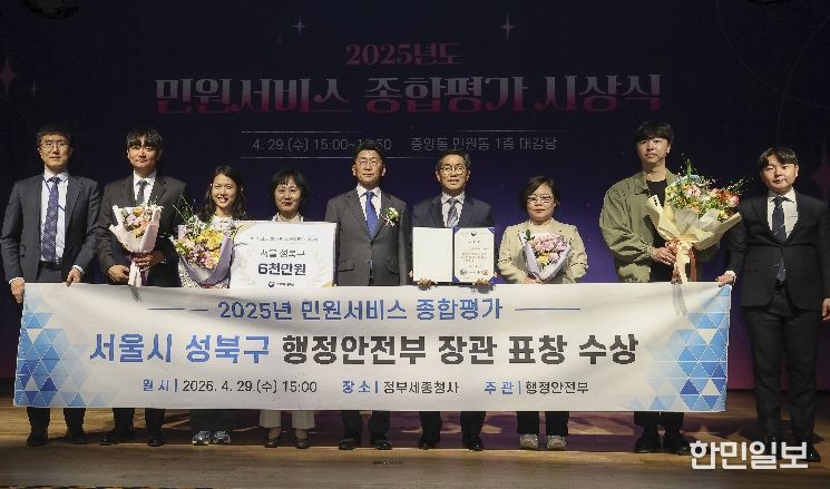 한민일보 서울포커스 김봉순 기자 | 서울 성북구가 행정안전부와 국민권익위원회가 공동 주관한 ‘2025년 민원서비스 종합평가’에서 행정안전부 장관 표창을 수상하며 민원행정 우수 지자체로서의 위상을 다시 한 번 확인했다.