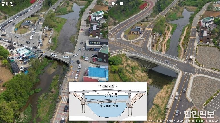 시는 이 문제를 해결하고자 고기교를 길이 46.4m, 폭 20m 4차로로 확장한다. 고기교 일대가 상습 침수 구역인 점을 고려해 교량 높이도 3.1m 더 높인다.