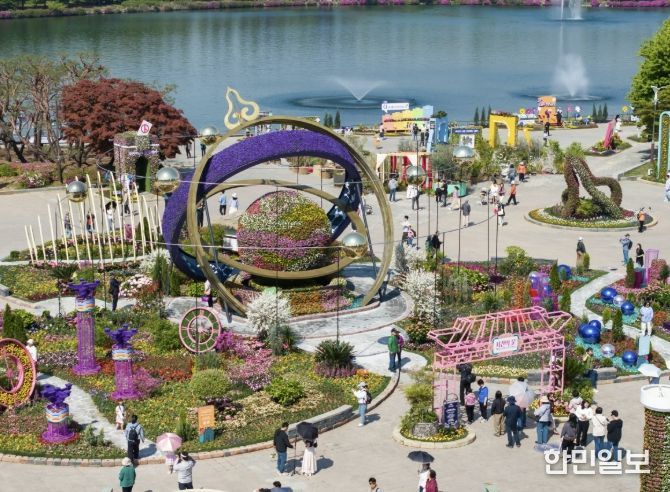 ‘꽃, 시간을 물들이다’를 주제로 열리는 꽃박람회는 야외정원과 실내 전시, 공연·체험을 결합한 복합형 축제로, 5월 10일까지 17일간 운영된다.