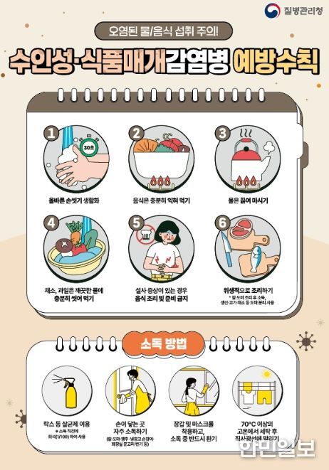 수인성ㆍ식품매개감염병은 병원성 세균, 바이러스, 원충에 오염된 물이나 식품을 섭취해 구토, 설사, 복통 등의 장관 증상을 유발한다. 이를 예방하기 위해서는 ▲올바른 손 씻기 생활화 ▲음식 충분히 익혀 먹기 ▲물 끓여 마시기 ▲채소ㆍ과일 깨끗한 물에 충분히 씻어 먹기 ▲설사 증상 시 음식 조리 및 준비 금지 ▲위생적으로 조리하기 등 예방수칙을 준수해야 한다.