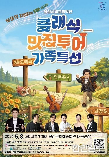 울산시립교향악단은 5월 8일 오후 7시 30분 울산문화예술회관 대공연장에서 백윤학 지휘자와 함께 즐기는 ‘클래식 맛집여행(투어) 가족특선’을 개최한다고 밝혔다.